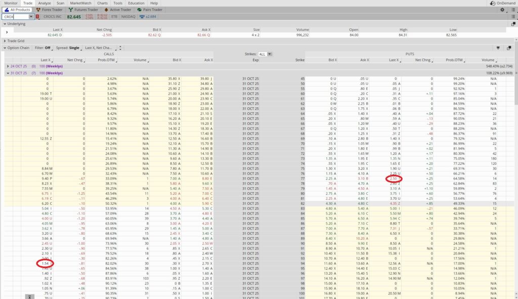 CROX has their quarterly earnings call next week, and that heightens the options volatility. That means we can get a lot of premium, much more than normal, by selling some option contracts right now. We want to be sure we’re comfortable with our buy price when we sell to open a put option contract that goes through the earnings call. Since our basis right now is $78.17 we’d like our put strike to be lower than that. That way we’ll reduce our basis if the trading price drops and we’re assigned shares. If we’re not assigned shares, we’ll still lower our basis because of the option premium. We’re ok with buying shares here because we’ll be getting shares at a price we’re comfortable paying. If we don’t get assigned shares we’ll just collect the premium and then sell another put when this contract expires.