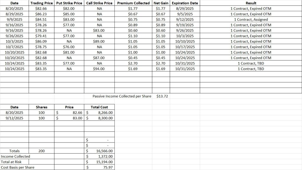 We’re also going to sell to open a covered call option contract. Since our cost basis is $78/.17 per share we can sell a covered call at any strike higher than that. If our shares are called away we’ll make money on the sale of the shares. If the trading price stays below our call strike we’ll keep our shares. Either way, we’ll keep the option premium we bring in when we sell to open the call option contract. The additional premium due to the upcoming earnings call means our call strike can be over 10% above the trading price and we’ll still generate some decent premium. We sold to open the $94 call strike for the 10/31 expiration date for $1.54 per share.