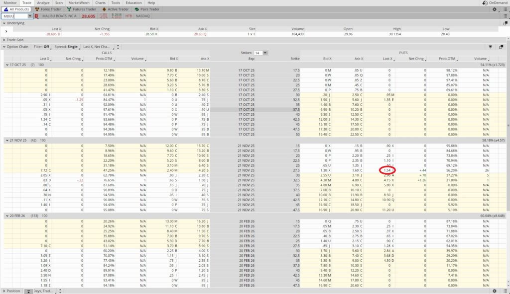If the trading price of MBUU drops below our $27.50 strike price we’ll have the choice to either buy the shares at $27.50 or roll the trade to a lower strike price with an expiration date that is further out in time. If we take the shares at $27.50 our cost basis will actually be lower than that. Remember the option premium we brought in when we sold to open the contract? That stays in our account regardless of happens with the trading price. So our actual cost for the shares will be the $27.50 strike price minus the $1.54 in option premium. That works out to $25.96 per share. We like that price even more than we like $27.50.