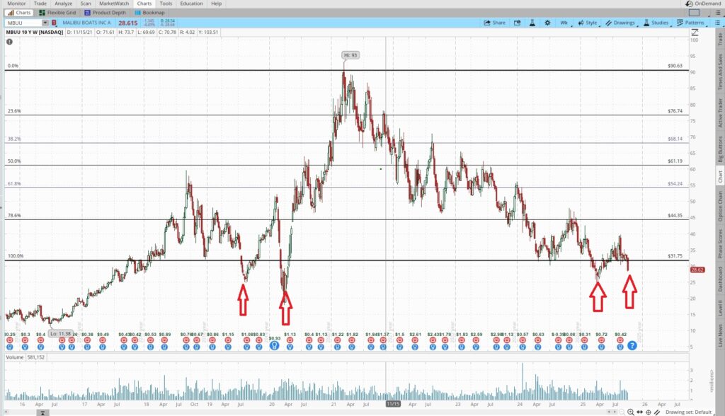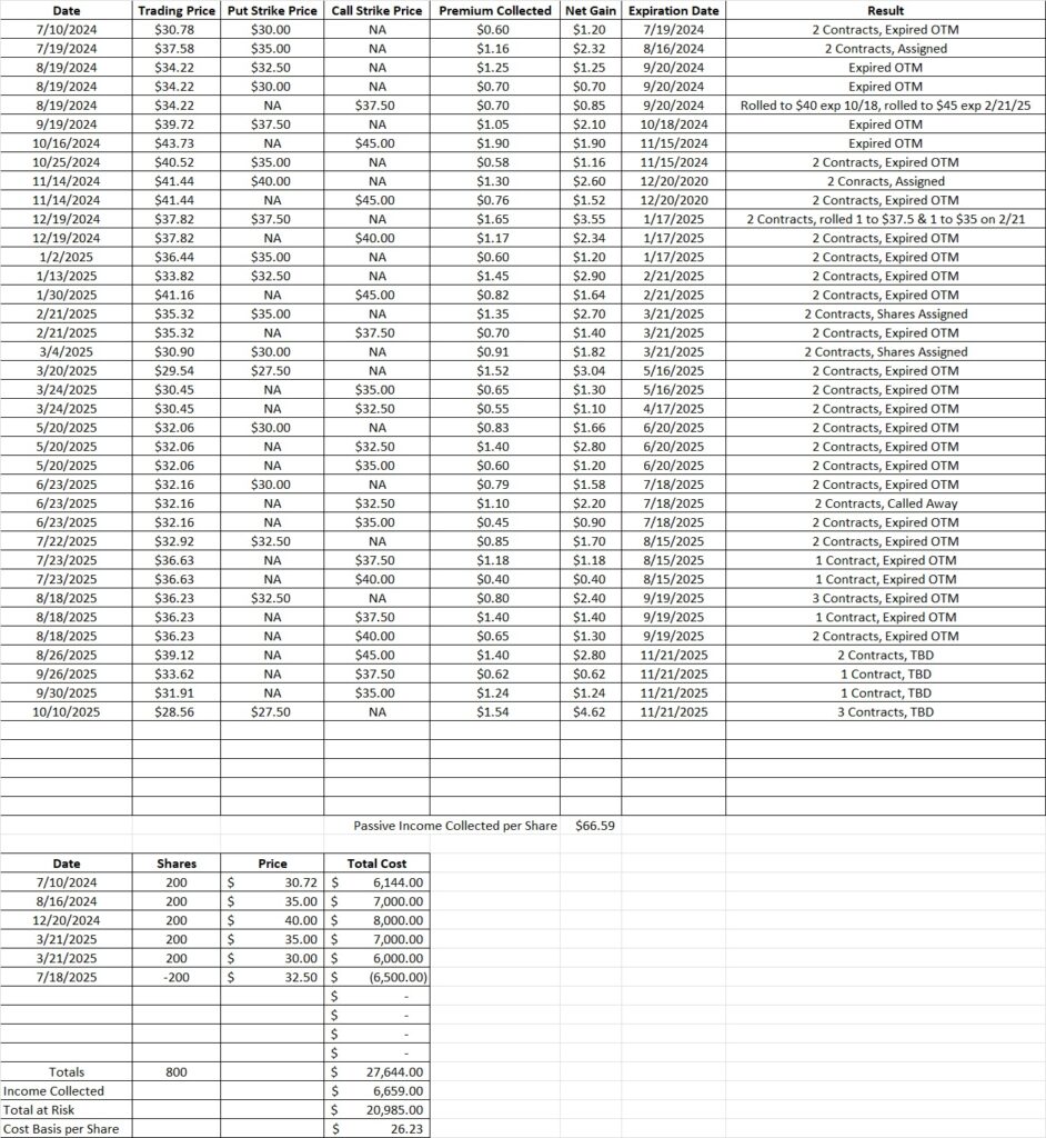 Now back to our 800 shares of MBUU. We currently have two covered calls for the $45 strike, one for the $37.50, and another for the $35 strike. Each of those contracts shares the 11/21 expiration date. This morning Trump talked about raising tariffs on China again and the market has been slumping. Today MBUU is trading near the low from the Trump Dump back in early April. Prior to that the last time MBUU traded at this level was during the Covid Crash during Trump’s first term. MBUU had an investor day at the end of September during which the company shared their plans for the future. Here’s one of our recent posts on that walks through our proven investment strategy on MBUU.
