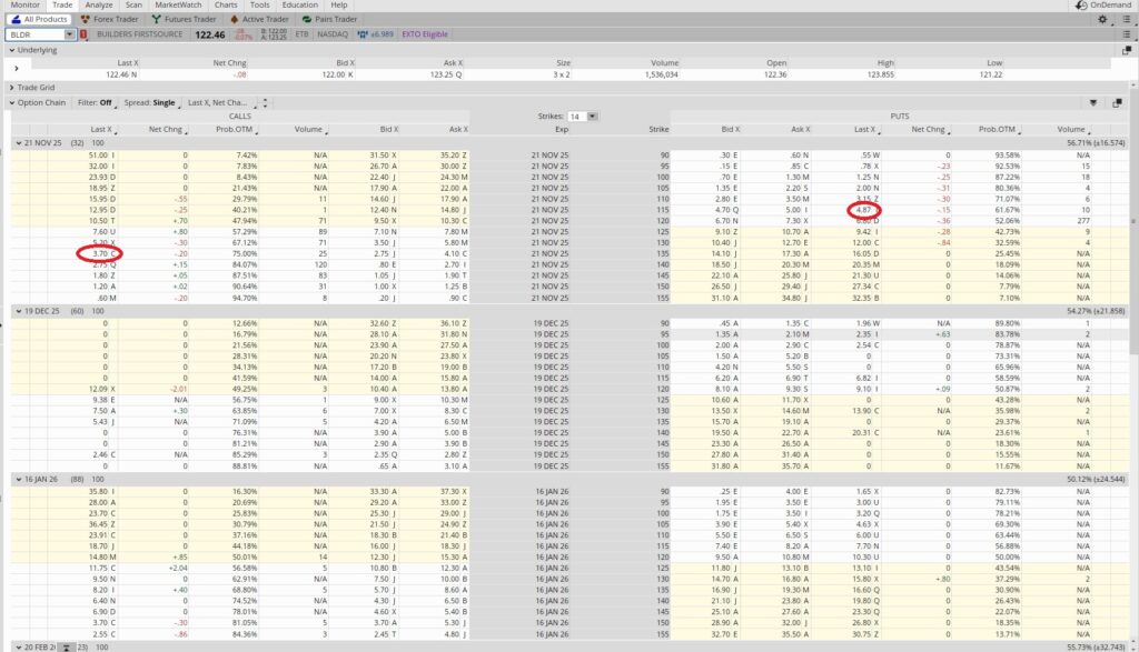 We’re making a promise to buy 100 shares of BLDR at the $115 strike price. We sold to open that contract for $4.87 per share. So we divide that option premium by the strike price and we get 0.042. Then we multiply that by our time period. This trade lasts for one month. There are twelve months in a year, so we could theoretically do this trade, or a similar trade on another company, twelve times over the course of a year. So we multiply our 0.042 by 12 and we get 0.508. So this option trade yields an income of 4.2% monthly, or 50.8% annualized. If the trading price of BLDR drops below $115 we’re committed to buying the shares. If BLDR continues to trade above $115 this put option will expire out of the money worthless. Either way, we keep the $4.87 per share in option premium.