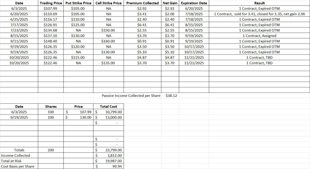 We currently hold 200 shares of BLDR in this portfolio with a basis of $104.22 per share. We bought 100 shares back on 6/3 at $107.99 per share. Then we’ve sold cash secured put options just below the money each month. We were assigned another 100 shares at the $130 strike on 9/19. Each time we sell a put option we bring in option premium. And each time we sell a covered call option we bring in more option premium. That option premium yields an income each month. Since we have 200 shares, we can sell one covered call option contract to collect more option premium each month. If the trading price of BLDR runs up through our call strike we can either let the shares go or roll the position.